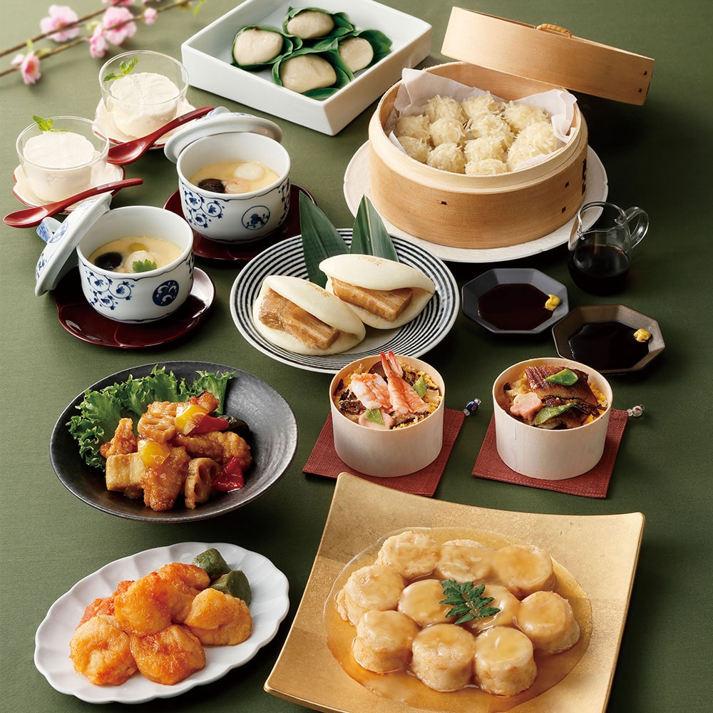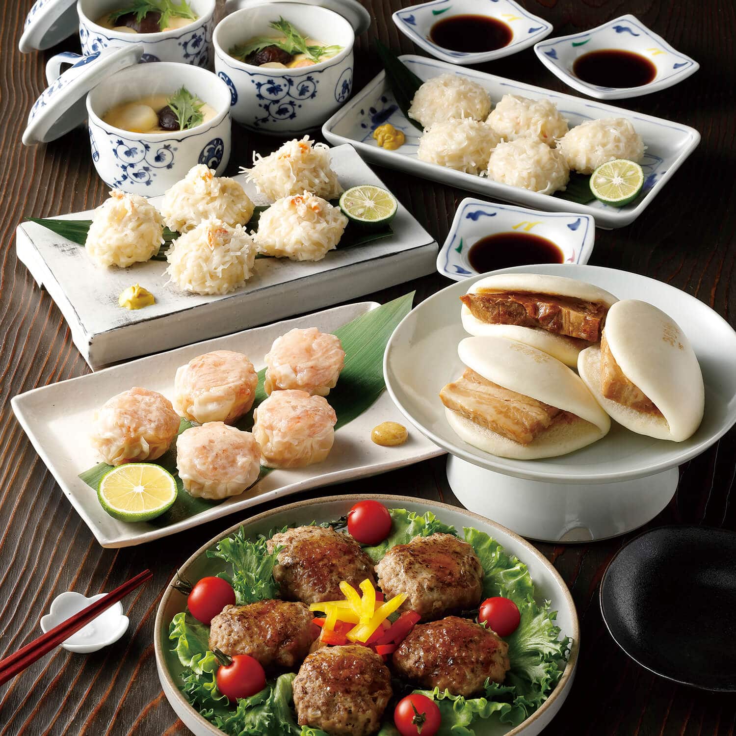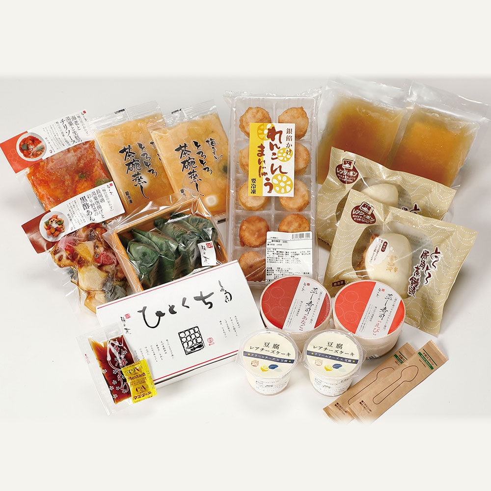 - ひとくちとうふしゅうまい(14g×12個)、※ぽんずしょうゆとミニ練りマスタード付、茶碗蒸し(140g)2パック、蒸し寿司あなご(150g)、蒸し寿司えび(150g)、豚角煮饅頭(70g)2個、長州鶏湯葉唐揚げと彩り野菜の黒酢あん(150g)、海老と湯葉と生麩のチリソース(150g)、麩まんじゅう(35g×4個入)、銀餡かけれんこんまんじゅう(33g×10ヶ入)、豆腐レアチーズケーキ80g2個