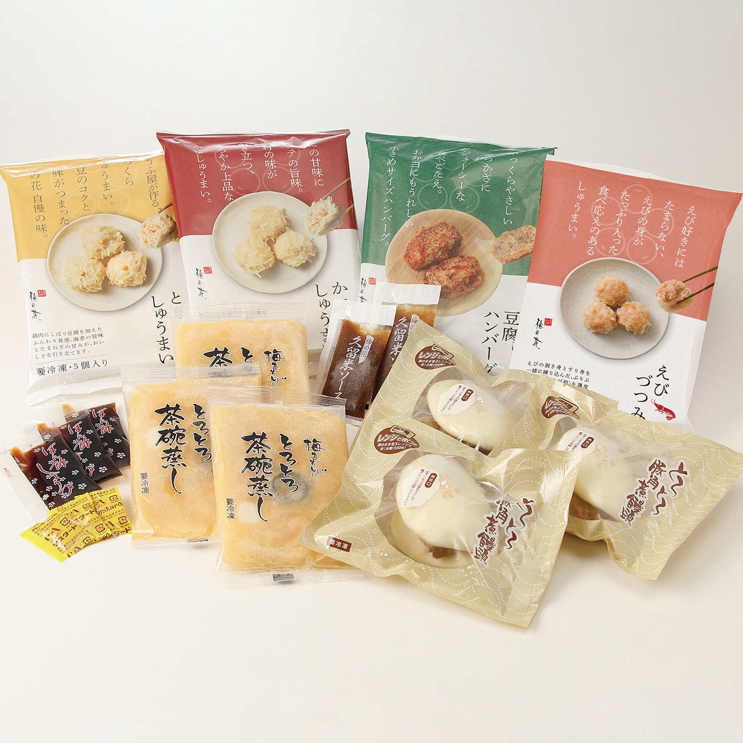 - ひとくちとうふしゅうまい(14g×12個)、※ぽんずしょうゆとミニ練りマスタード付、茶碗蒸し(140g)2パック、蒸し寿司あなご(150g)、蒸し寿司えび(150g)、豚角煮饅頭(70g)2個、長州鶏湯葉唐揚げと彩り野菜の黒酢あん(150g)、海老と湯葉と生麩のチリソース(150g)、麩まんじゅう(35g×4個入)、銀餡かけれんこんまんじゅう(33g×10ヶ入)、豆腐レアチーズケーキ80g2個