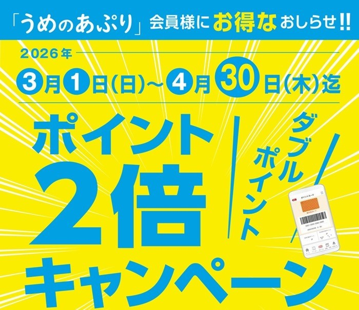 2026年3月1日(日)~2026年4月30日(木)の間、Uポイント2倍キャンペーンを開催します。